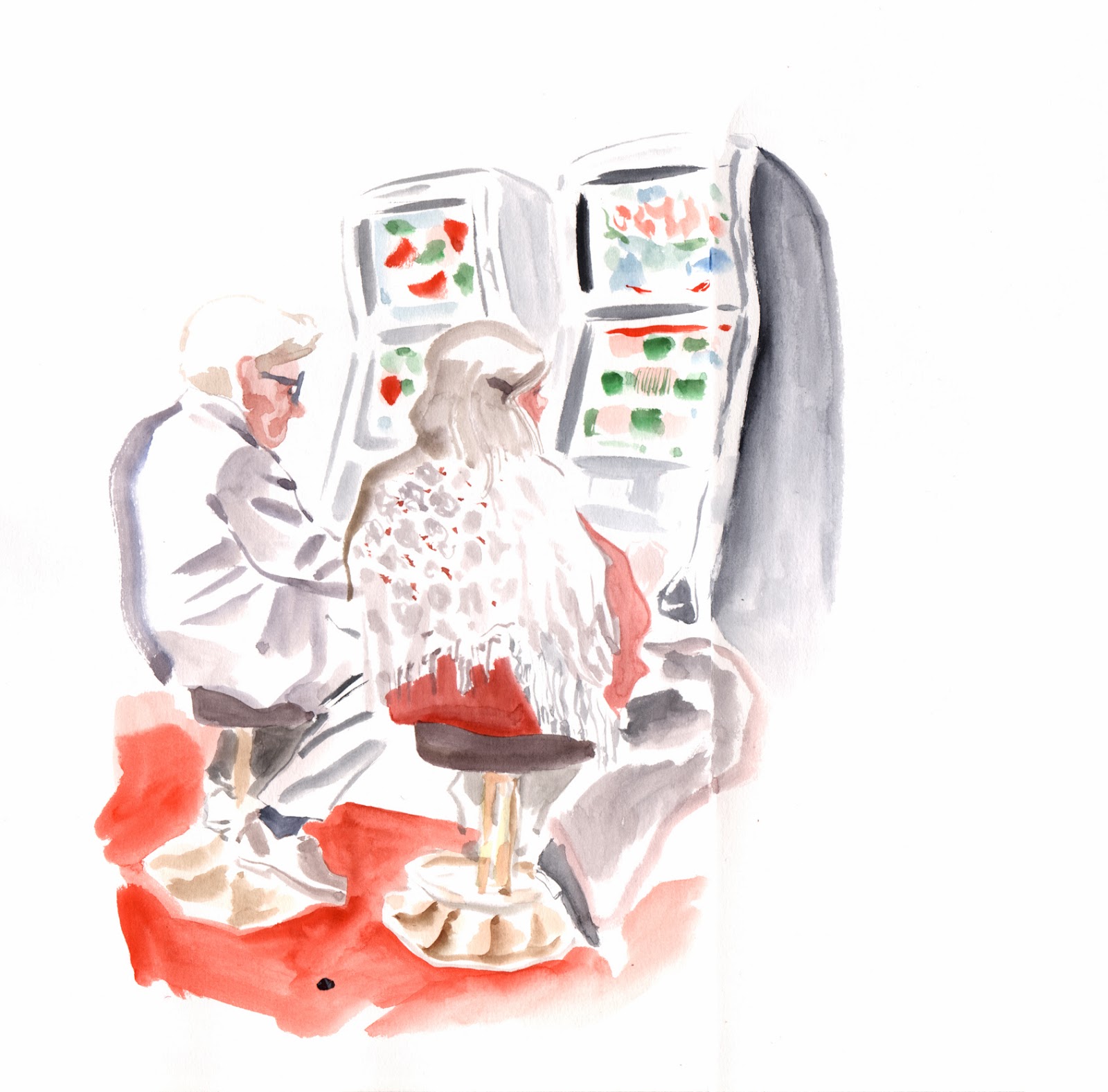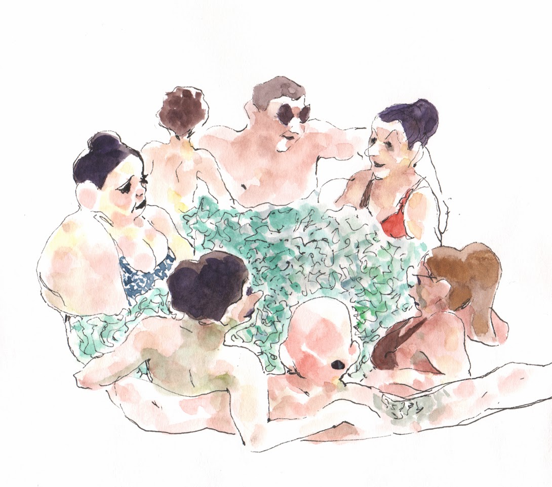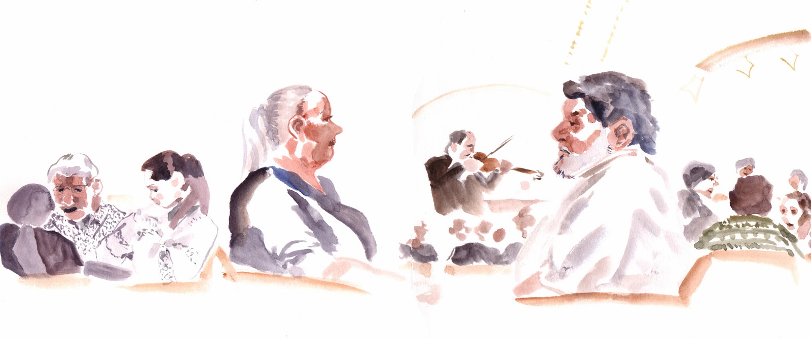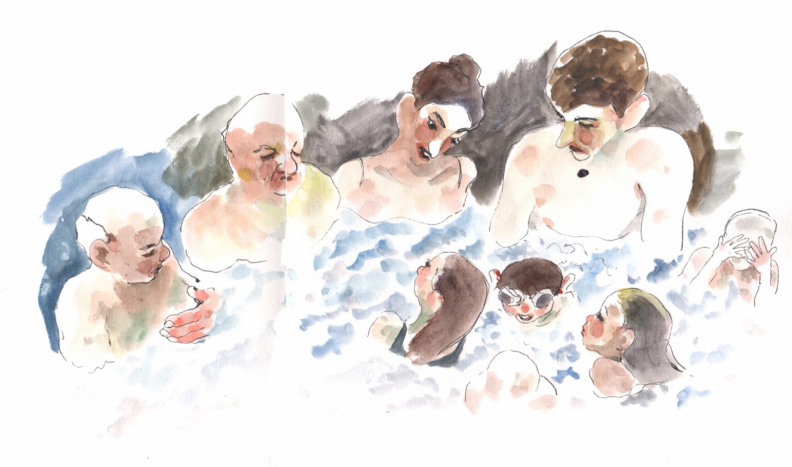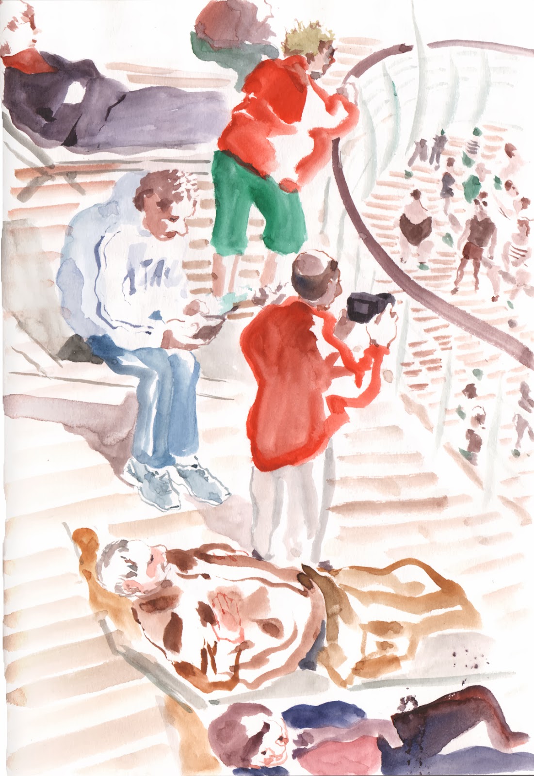 Vous êtes donc confortablement installé, une jambe en suspension, les mains frigorifiées dont une qui retient les pages du carnet pour ne pas qu'elles défilent pendant que vous dessinez, votre nez goutte sur le carnet mais comme vous faites de l'aquarelle, après tout ça peut faire des accidents sympas.